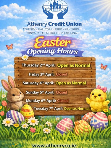 Applications can be made here on our website or by visiting your local Athenry Credit Union branch between February 5th and March 12th 2026. Terms and conditions apply.